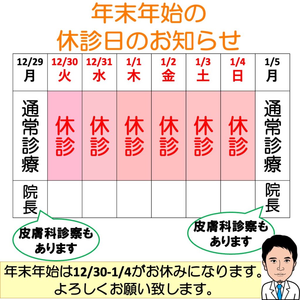 年内は2025年12月29日(月)まで、年始は2025年1月5日(月)より通常通り診察させて頂きます。